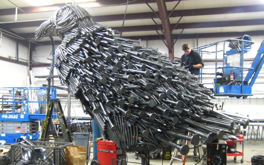 Will Ryman, the son of minimalist painter Robert Ryman, has prepared three installations taking up both Paul Kasmin Gallery spaces— he is the first artist represented by the gallery to do so. For the 293 Tenth Avenue space, Ryman has crafted a 90-foot Everyman lying against the perimeter of the gallery walls. Four hundred and eighty-five shoes make up the figure’s shirt. His limbs are made of three thousand silver bottle caps. In the next room, Ryman’s labyrinth of paintbrushes is installed. The fourteen-foot tall sculpture consists of two hundred thousand paintbrushes stacked on top of one other in an organic structure. In the 515 W. 27th Street space, Ryman displays a 12-foot high, 16-foot wide Bird. The colossal Edgar Allan Poe-inspired sculpture is made with fifteen hundred fabricated nails and weights about two tons.