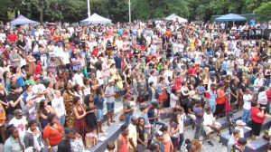 Even with rain clouds looming overhead, Brooklyn wouldn’t be stopped from coming out to support their own. DJ Stormin’ Norman kept the early arriving attendees amped by playing classic records from BK’s own Notorious B.I.G. and Jay-Z and vendors provided fish platters and frozen icies to satisfy the crowd’s appetites. While local residents played softball and set-up lawn chairs in the park’s fields and open lawns, popular hit songs blasting from the speakers could be heard from blocks away. Everyone from young children with painted faces to writer/activist Micheala Angela Davis could be seen dancing in front of the stage to Rihanna’s “We Found Love” and Junior Mafia’s “Get Money”.