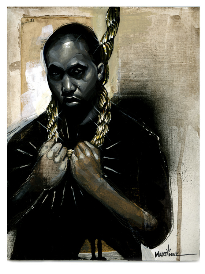 Martinez was raised in Pasadena, California surrounded by gangs and graffiti. Naturally, this environment impacted his voice as an artist. While Martinez avoided gang initiation, his neighborhood rarely avoided the consequences of gang rivalries, and a lot of his art attempts to address the complications of that lifestyle. These themes are advanced through Martinez’s formal training in concept and art theory. But before he studied fine art at the Art Center College of Design, he studied the essentials of street art by burying himself in the classic hip hop documentary Style Wars and the graffiti culture magazine Can Control which helped spark his early interest in tagging rooftops and freeway spots.