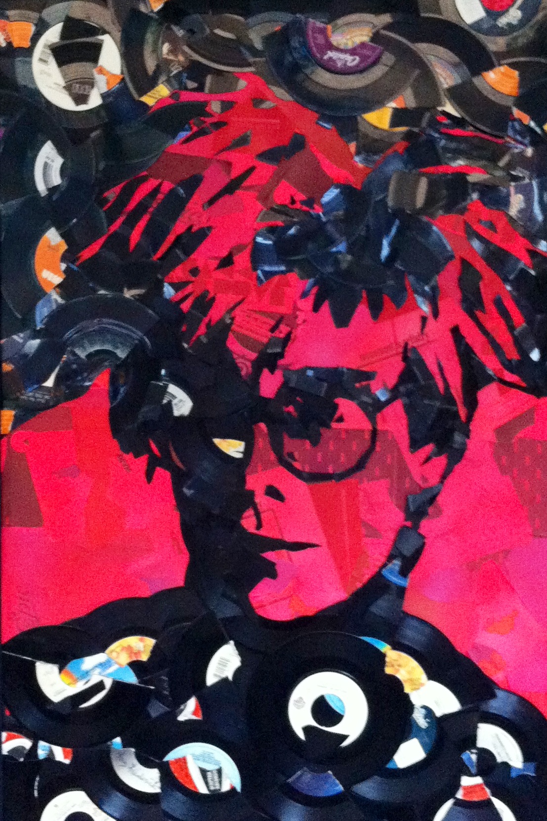 Frederick, a photographer by trade, decided to expand from capturing images with a camera to creating original pieces of art from recycled broken records and their packaging.  Frederick’s “Vinyl Pop Art” series is an homage to pop art’s most instrumental forerunner, Andy Warhol, and legendary street artists like Banksy and Shepard Fairey. In essence, Frederick’s work is a visual mash-up of these artists’ impressionable styles with his own imaginative take on iconic images and individuals of pop culture lore. And of course, his first vinyl work was a portrait of the eccentric leader of The Factory studio of the 1960’s and creator of the idea that everyone will inherently be at the center of popular culture for at least 15 minutes.