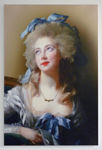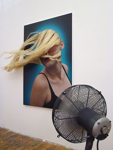 APS: There is a woman on the canvas. A fan is blowing the real human hair sewn through the canvas into her face, thereby hiding her visage. The perception of this symbol of beauty and desire is modified, blurred.
