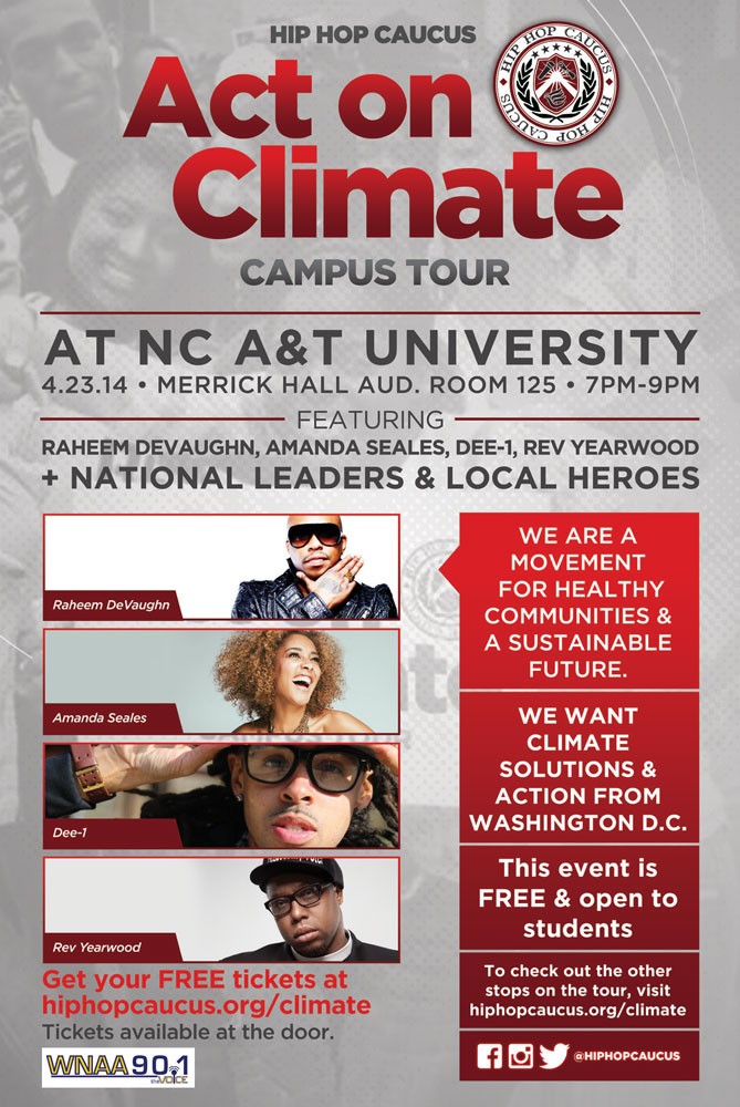 The Hip Hop Caucus Act on Climate Campus Tour is scheduled for Howard on April 22nd, N.C. A&T on April 23rd, and CAU on April 24th. Previous stops included Virginia’s Hampton University, Ohio’s Central State University, and Michigan’s Wayne State University.